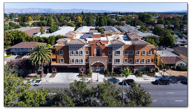 | In this example, our drone is 45 feet above ground, above the tree line, showing a nice view of the building facade, roof patio and proximity to the South Bay hills. |