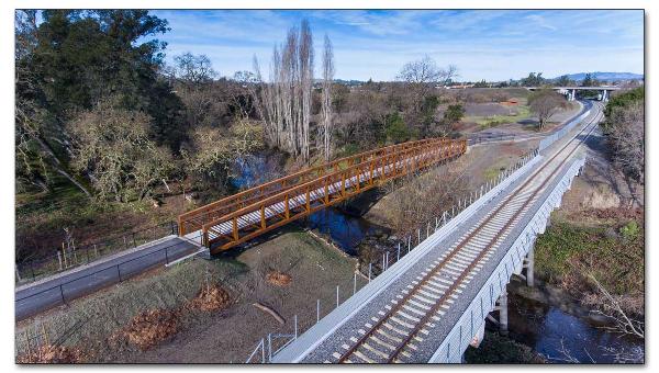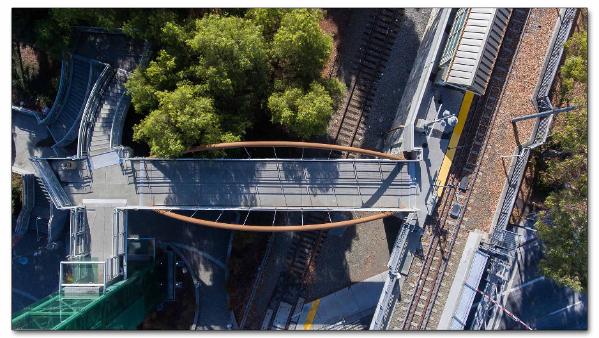 | This is a vertical, or bird's eye view, of a pedestrian bridge in the South Bay. A drone is a much more cost effective choice for low altitude aerial photography compared to an airplane or helicopter. |